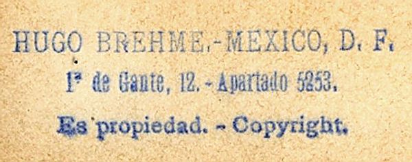 The earliest postcards found to date were postmarked in 1912. They bear two addresses: post office box 5253 and 1a. San Juan de Letran, No. 3, in Mexico City. Brehme's backstamps reflect the changes of his post office box number over the years and the relocation of his studio from San Juan de Letran to Cinco de Mayo to Madero to Gante. Purple markings placed at the stampbox, as shown at the middle right, were subject to being hidden by postage stamps.