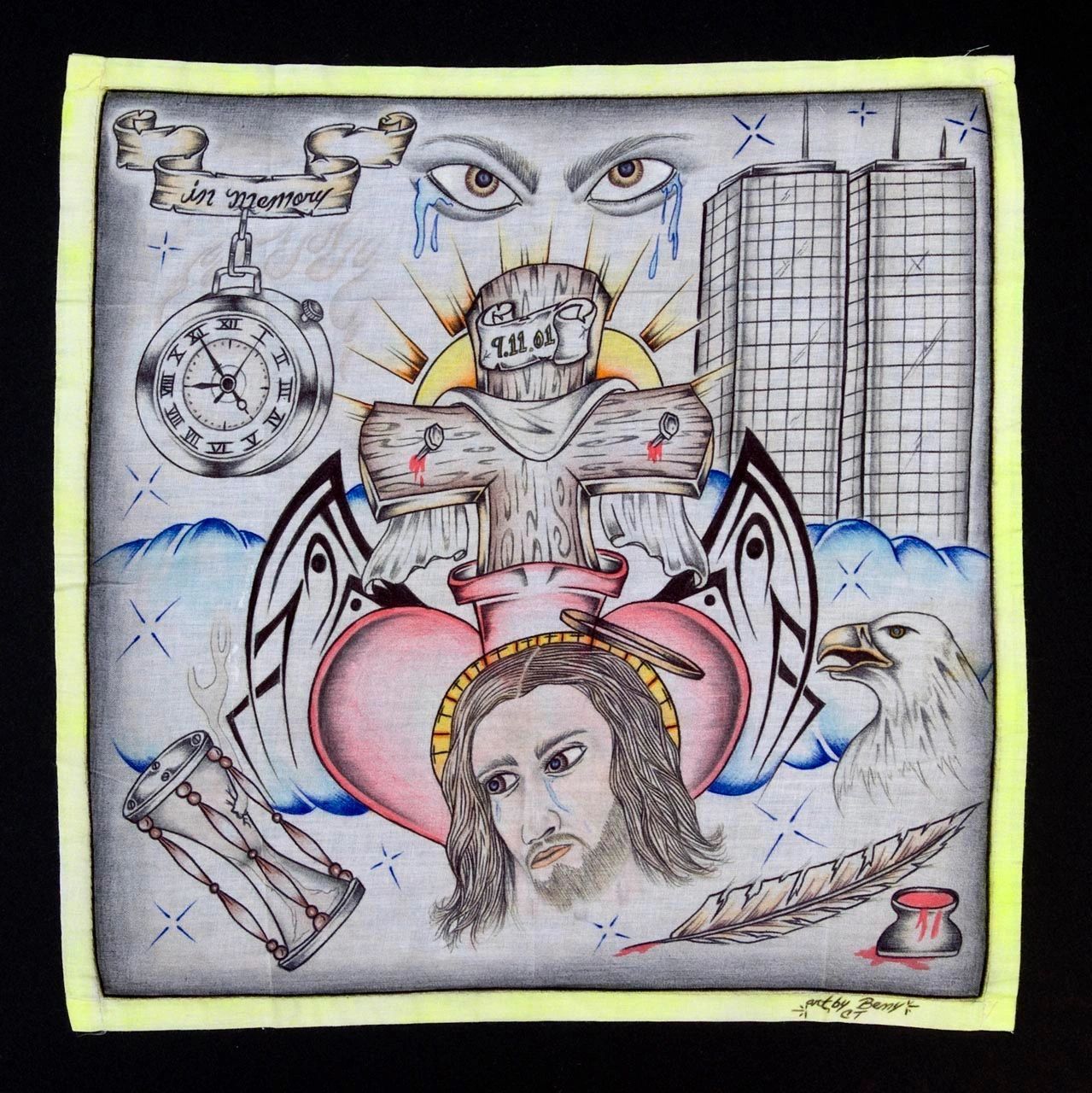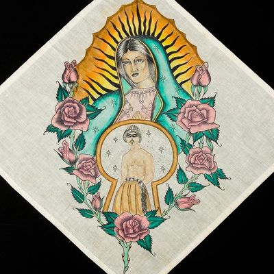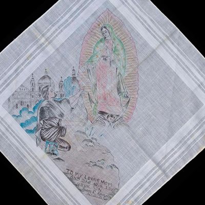 Such expressions of faith and love on handkerchiefs, called “pañuelos,” probably originated in the 1940s among Mexicans incarcerated in Texas jails. The indigenous art has flourished among inmates, and it continues to be the artistic domain of Catholic-Hispanic males. As an example, an artist used a Fruit of the Loom handkerchief to depict Juan Diego kneeling before the Virgin, with the Basilica of Guadalupe in the background. The prisoner inscribed the drawing a week before Christmas, “To my loving Mom and Dad with love, your son, Juan D. Gonzales, 12-17-76.”